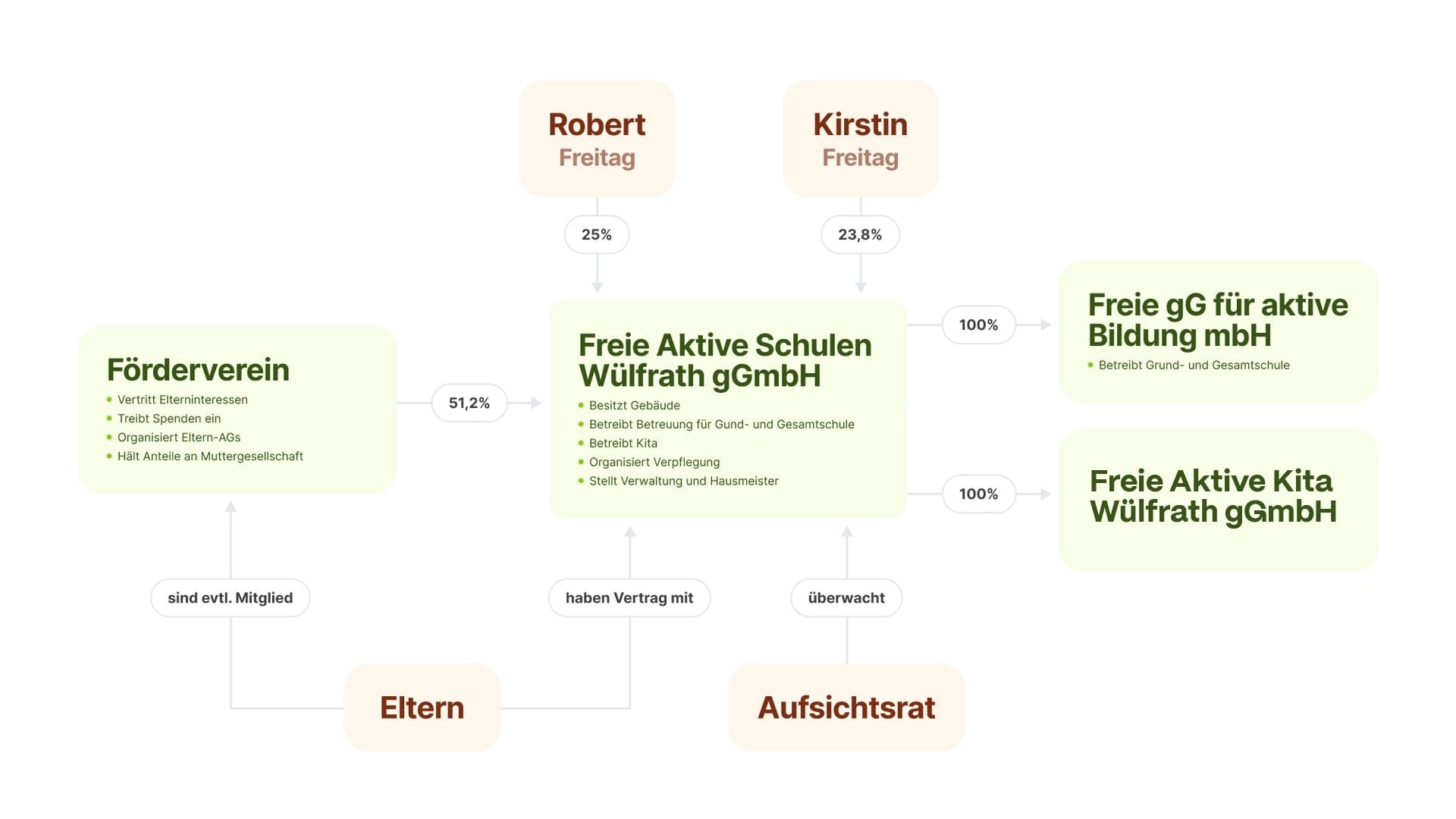 Fast alle Erziehungsberechtigten der Schul- und Kita-Kinder sind organisiert im Förderverein, dem Kern der gesamten FASW-Gesellschaftsstruktur. Mitglieder sind außerdem Beschäftigte sowie Förderer der Einrichtungen und des Konzepts. Der Verein wird seinem Namen durch die materielle und ideelle Förderung der FASW-Einrichtungen gerecht, etwa durch Öffentlichkeitsarbeit, das Einwerben von Sponsoren oder die Organisation der Elternmitarbeit in unterschiedlichen Arbeitsgruppen. Der Förderverein hält derzeit 51,2 Prozent an der Freie Aktive Schulen Wülfrath gemeinnützige GmbH, die übrigen 48,8 Prozent halten die Gründungseltern Robert und Kirstin Freitag. Diese Gesellschaft besitzt die Gebäude, organisiert die Betreuung an den Schulen und stellt Verwaltung und Hausmeister. Hundertprozentige Tochter der gGmbH ist wiederum die Freie gemeinnützige Gesellschaft für Aktive Bildung mbH, die eigentliche Schulträgergesellschaft, die für die Durchführung des Unterrichts zuständig ist.