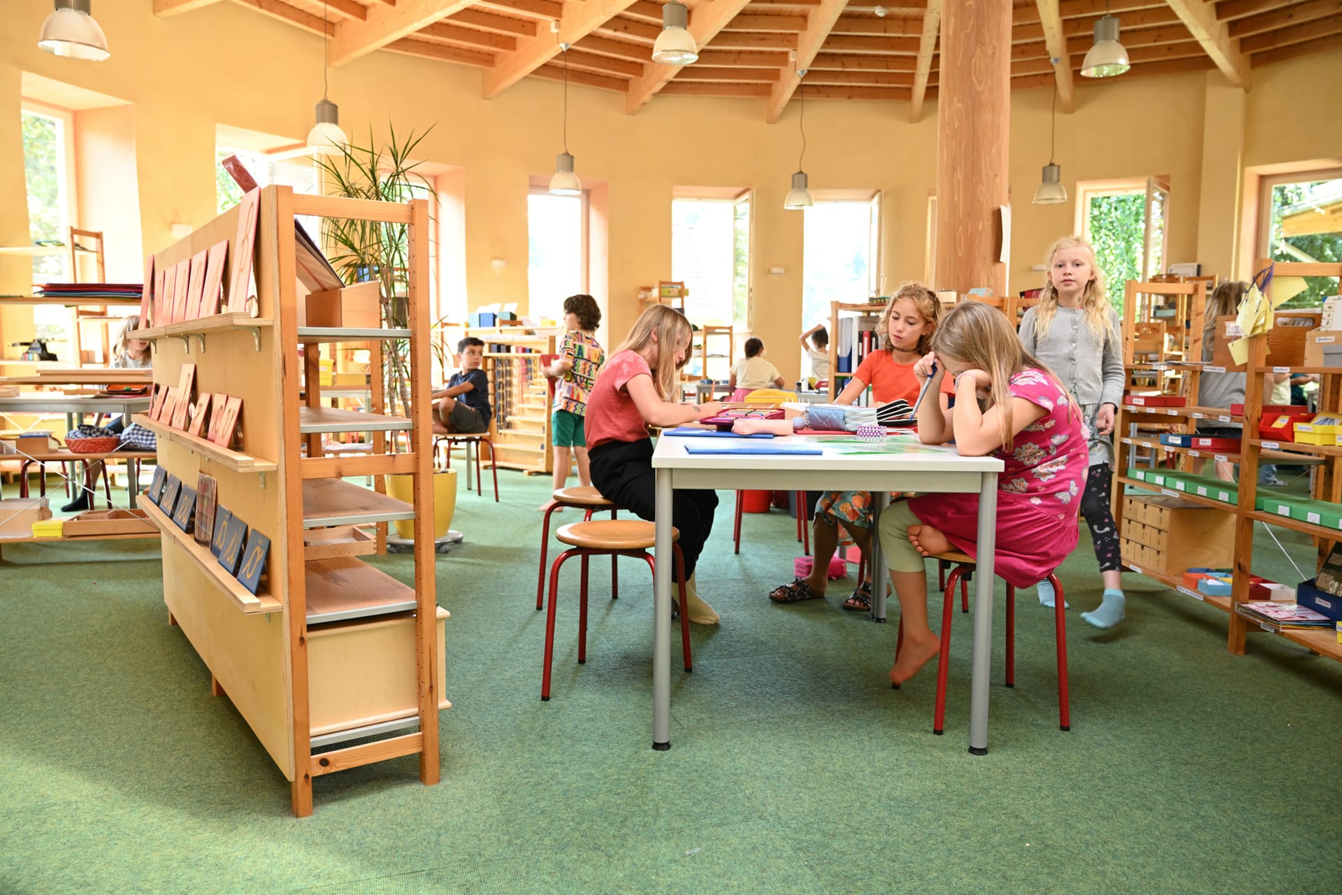 Von 8:00 bis 8:30 Uhr kann an der Schule gefrühstückt werden, ein zweites halbstündiges Frühstück gliedert um 10:15 Uhr den Vormittag. Um 12:30 Uhr kümmern sich die Dienstegruppen um spezielle Aufgaben, die die Mitverantwortung der Kinder für ihre Schule stärken. Zwischen diesen Tagesstrukturen bilden freie Arbeits- und Spielzeiten, in denen die Kinder nach eigenem Rhythmus lernen, den Hauptanteil des Grundschulalltags. Jeweils ein bis zwei individuelle Wochenlernziele werden gemeinsam mit den Lehrkräften festgelegt und müssen täglich abgezeichnet werden. Für jeden Lernstoff gibt es geeignete Materialien wie z. B. farbige Perlenstäbe zum Verständnis von Zahlen und Mengen, so dass ein Lernen mit allen Sinnen möglich ist. Kurse und AGs zu festen Zeiten, etwa für Sport, Schwimmen, Religion, Chor- oder Englisch-Angebote, ergänzen die Freiarbeit.